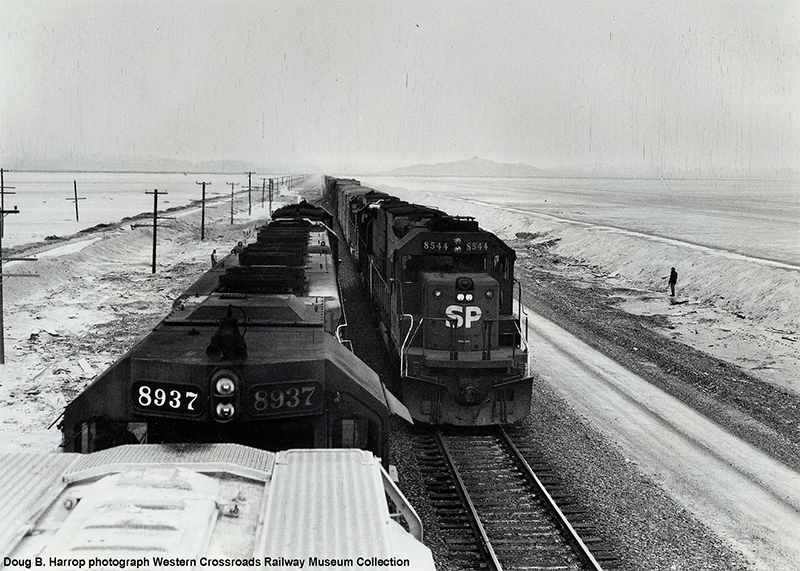 Two Southern Pacific freight trains meet at Lemay, Utah, on the Lucin Cutoff causeway in April 1980. Doug Harrop photograph, Western Crossroads Railway Museum collection.