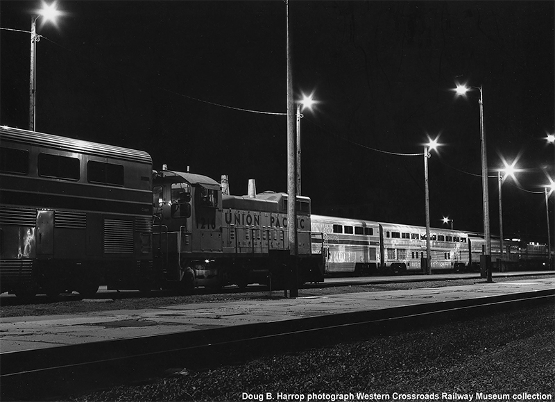 A Union Pacific switch locomotive assembles the Desert Wind and Pioneer passenger trains on the night of May 15, 1983 at the Ogden Union Station. Doug Harrop photo, Western Crossroads Railway Museum collection.